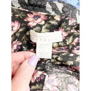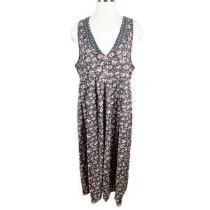This jumper/dress is sleeveless floral and v-neck with cottagecore bohemian retro remix. By EXPRESS pleated dress. Lovely floral design in black with pink-green-white.