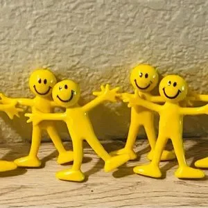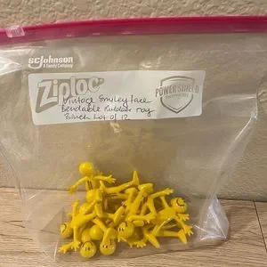 Pre owned like new , open box , 2016 vintage rubber toys yellow smiley face toy about 3” , lot of 12 , see pics for details