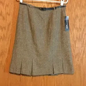 Norton McNaughton Petites Brown Skirt with specs of pink. Belted, lined and pleated hem. Country Luxe on tag. Size 10 Petite. Zipper on side with hook and eye. Made in China of Acrylic, Polyester, wool, Nylon,Cotton and Rayon. Lining made of 100% Polyester. New with tags. Dry clean only.