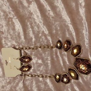 Kate and Sophia earrings and necklace set. These are brand new, never even tried on. The turquois earrings are 3 1/2 inches with red stones. The brown tiger stone necklace is approximately 22 inches from clasp to clasp.