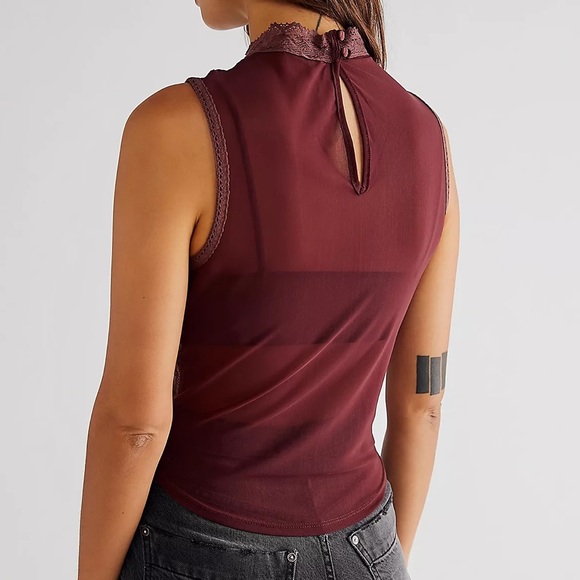 Turn heads in this timeless tank featured in a high-neck, cropped silhouette and lace-adorned, sheer fabrication for added versatility.