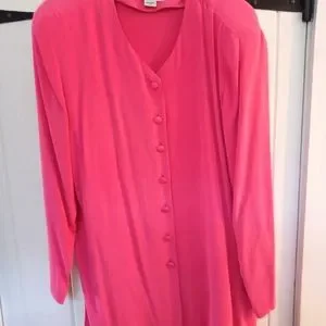100% Silk. Coral Pink Color .SIZE 12 Length on Skirt 25 inch. Elastic Wasit Zip Back Jacket / Tunic Length 29 inch Pit to Pit Chest 20 inch Sleeve 17 inch Pads on Shoulders.