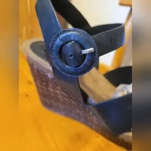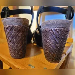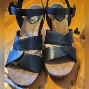 Sofft Casidy wedge sandals, black leather with cork and brown weave pattern heel, foam footbed, adjustable buckle, 3.5in heel height with 1in platform, size 9.5.