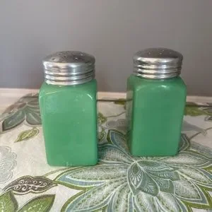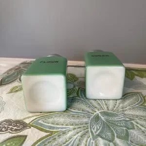 Vintage Jadite Flour and Sugar Shakers. Originally bought from an antique shop. In excellent used condition. No major flaws.