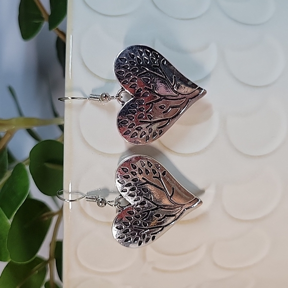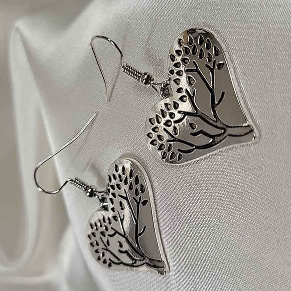 Even prettier in person.. engraved tree on heart-shaped dangles. A bit on the heavier side; rhodium plated for lasting shine. On stamped S925 wires.