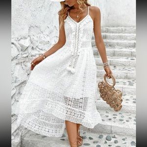 White Guipure Sheer Mesh Lace Tassel Cami Dress Boho