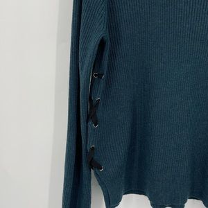 John + Jenn Turtleneck Sweater Ribbed with Lace Up Side Detail Teal Size Large