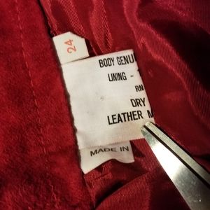 Lovely vintage skirt in a reddish violet hue. Some marks/surface stains, but not particularly noticeable with the vibrant color. Measurements available in photos. Used condition. 100% pig leather. Waist has some stretch as there is elastic in the waistband back.
