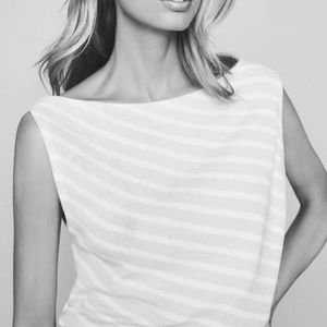 The Bex top in white and light pink reimagines a classic tank silhouette with an asymmetric sleeveless silhouette and is knitted into a striped slim-fit design. Team yours with denim and sneakers for a casual summer look.