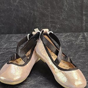 New girls Cat and Jack Ballet style dress flats. A rose gold glitter slipper dress shoe, adorable black crisscross straps and bow in back. Size 6 toddler girls. Brand Cat and Jack. Condition, new with tags. Non smoking pet free home.