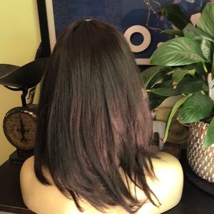 Lovely dark brownish black with a little hint of burgundy. Nice layered wig with bangs. Very soft adjustable cap. Good shiny condition.