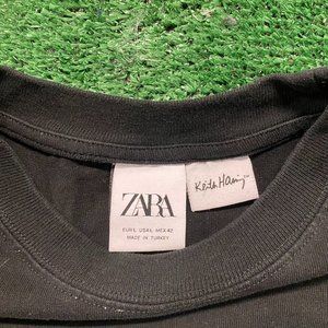 Black short sleeve crewneck heavyweight t-shirt with white Keith Haring Collection New York Artist graphic and red heart face back hit. Boxy fit.