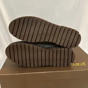 Approximate measurements: Flat wedge heel 1.25"H; Sole 1"H; Shaft 10"H; Opening circumference 13"