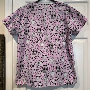 Adorable kitty cat v-neck women’s scrub top in size medium. Cotton/polyester blend. Feels like soft brushed cotton. 3 pockets with side slits. Minimal wear. No stains, holes or rips