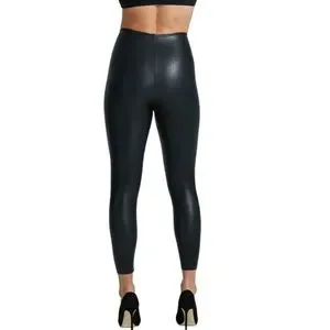 Our faux leather fabric has phenomenal four-way stretch, raw-cut edges and smoothing properties. These faux leather leggings are made with commando's signature internal waistband, flattering high-rise, and a slightly shorter length, raw-cut hem. Perfect for more petite frames, or for showing off your favorite shoes.