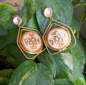 it's very beautiful handmade gold platted stone studded drop earrings perfect for every occasion and goes with every outfit western/Indian/indo-western it is made of brass gold plated very beautiful and long lasting product