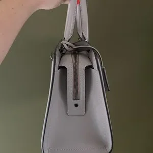 Refined calf leather, zip top closure and fabric lining. Detachable, adjustable strap for cross body wear. Outside open pocket. Color is Grey Birch.