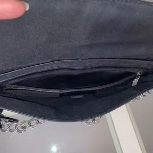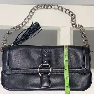 Express Black Genuine Leather Chain Tassel Shoulder Purse. Measurements: Length 10.5,” Height 5.5,” 10” drop. Excellent condition, no flaws to note, still has paper wrap on zipper. Features: button snap main closure, large zip pocket, silver toned hardware. Perfect for a night out on the town!