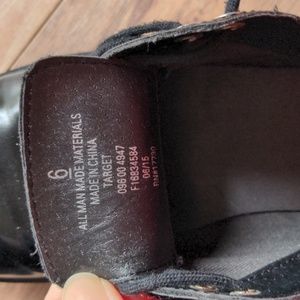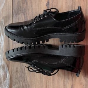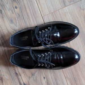 Like new. Worn only once indoors. Shoes have been professionally polished. No scuffs or scratches. Bottom of shoes has minimal wear.