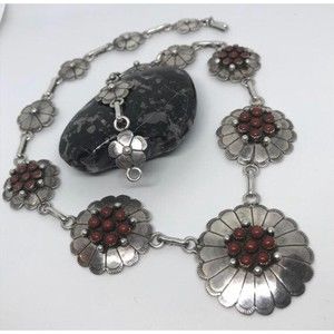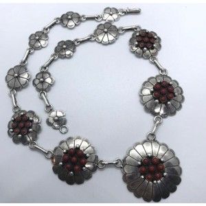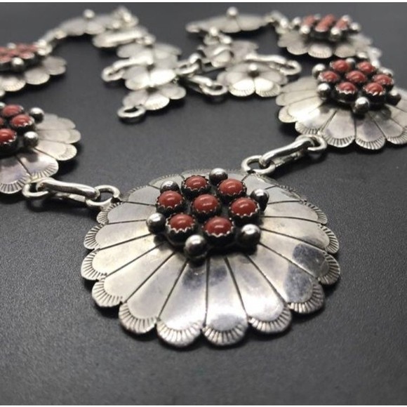 Stunning, Vintage Navajo Benson Boyd signed sterling necklace. Features flower design with etching. 1 Center pedal is 1 1/2” round, followed by 2 at 1 1/8”, 2 at 15/16”, 2 at 3/4”, 4 at 5/8” and 2 at 1/2”