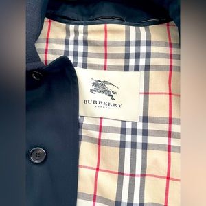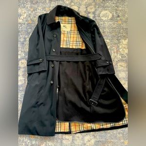 Stylish Burberry long trench coat with removable liner.