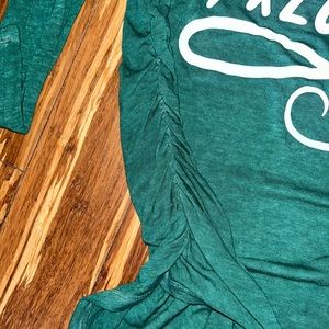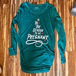 Green maternity top that says ‘tis the season to be pregnant
