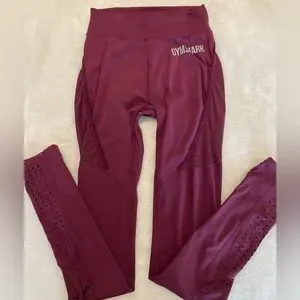 Excellent condition Gymshark Geo Mesh leggings, original design model, beautiful maroon color. Nice laser cut detail on side with pockets. Worn once!