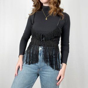 Stunning sheer lace fringe corset bustier tie front vest top. This is the perfect piece for a classy boudoir photoshoot or worn around the house for a not-so-innocent alluring look😉. You could also easily incorporate this into your everyday wardrobe by pairing it under a blazer or over a button down blouse. Very versatile and fun piece to add to your collection!