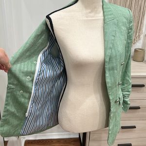 A double-breasted silhouette and mint green hue strike the perfect balance of sweet and sophisticated on this power blazer by Veronica Beard.