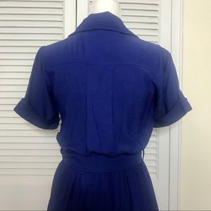 Excellent condition. Purchased from ModCloth. Blue linen knee length shirtdress by Moon. Features elastic waistband with removable matching fabric belt, matching fabric covered buttons down center front, and cuffed short sleeves. Comes from smoke-free/pet-free home.