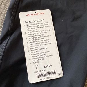 These are one of 2 pairs of LULULEMON SURGE LIGHT TIGHTS my son purchased and didn’t care for them afterwards, there is also a black/ grey pair listed here on my closet bundle for a great price ! They are both in like new condition! No ware or damage