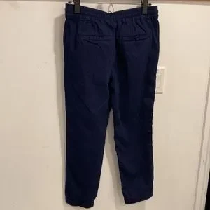 Woven cotton pants with elasticized ankle bands. Front/pockets elastic waist band, twill drawstring, and two back pockets that are still sewn shut.