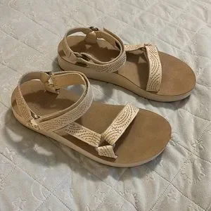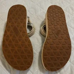 Purchased these really cute and comfortable Teva sandals from Anthropologie and I have worn them just twice. They are super comfy and go with everything, I just have bum knees and need more supportive shoes. They are in overall excellent, near perfect condition, with minor wear visible on the sides of soles (I’ve tried to capture this with photos of all sides, they look better than photos reflect IMO). These are Polyester uppers with EVA soles. Adjustable Velcro at both toe and ankle strap. Smoke free, pet friendly home. Come with original box. Open to reasonable offers!!