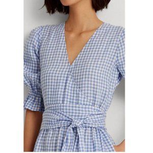 NWT Lauren Ralph Lauren Gingham Fit-and-Flare Linen Dress, Light blue