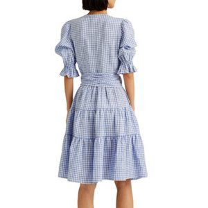 A flirty fit-and-flare silhouette and breezy linen unite with puffed elbow sleeves and timeless gingham to create the ultimate spring-ready style. Concealed left-side-seam zipper with a hook-and-eye closure Surplice neckline with a hook-and-eye closure Puffed elbow sleeves Elasticized ruffled cuffs Shirring into the sleeve caps Side on-seam pockets Attached self-tie sash Tiered skirt Tiered skirt Shirring into the seams Fit-and-flare silhouette