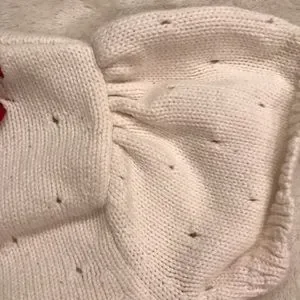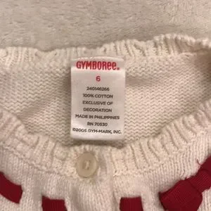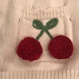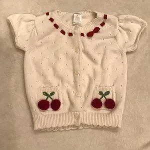 So sweet short sleeve sweater with adorable cherry pom poms on the front pockets. Red ribbon woven into the collar. Perfect for summer parties!