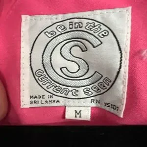 Features: Elastic waist, wide angled collar in purple, button-up, pockets