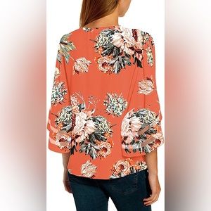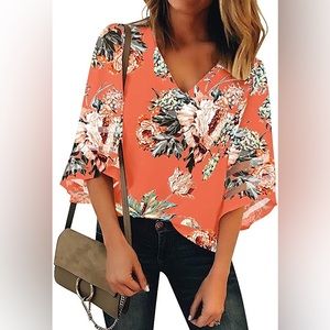 Floral Salmon V Neck Blouse with Bell Sleeves