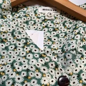 Monte New Floral dress with decorative buttons down the middle. Dress lays slightly above the knees and im 5”3. Its perfect for any occasion. Pair this up with a nice straw hat, and some nice accessories and you’re ready to go out the door.