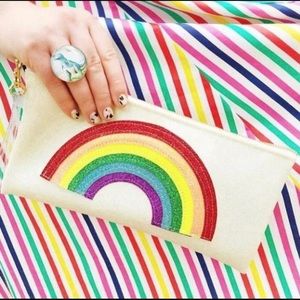 Never used, new without tags rainbow clutch by Julie Mollo. Perfect for pride! This super cute clutch features a glittery rainbow canvas applique and glitter infused vinyl that is easy to sanitize and disinfect. There are light pink marking and 2 black markings on the back (pictures) price has been adjusted to reflect discoloration. Comes from a smoke-free/pet-free home.