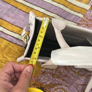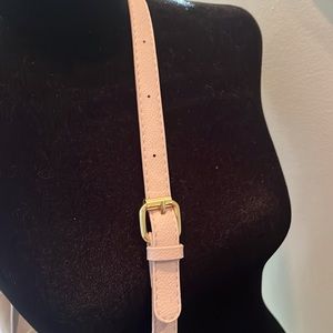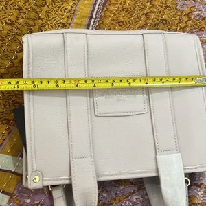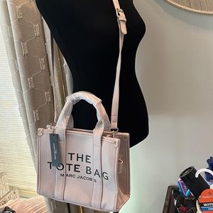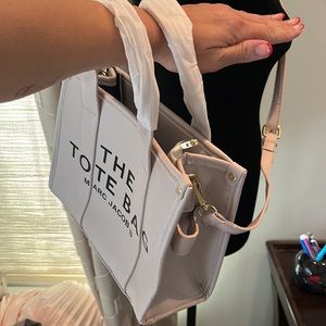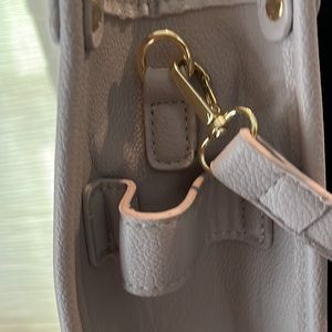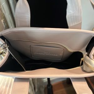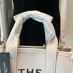 Beautiful, soft leather strap for the shoulder or handles to carry. It appears to be a very light pinkish cream color first time I found a mark Jacobs like this, and I would rather share it with people thank you put myself I have too many and these bags are so hard to find. I am not one that loves words all over purses, but when it comes to Marc Jacobs, I make an exception.