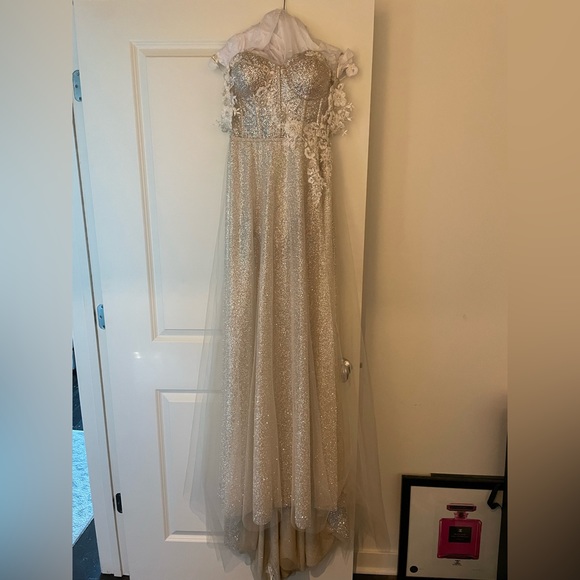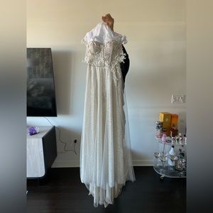 Wow your wedding guests in this stunning sparkly Berta Harper dress, perfect for a destination or spring/summer wedding. This dress comes with two flower-beaded detachable off-the-shoulder straps so your arms aren't restricted when it's time to hit the dance floor. The dress is a corset top with intricate beading around the waistband and has built-in peek-a-boo shorts and a high left slit. Button and loops on the inner bottom of dress to shorten train. This dress has been worn twice for photos only and has room for alterations. (The long cathedral veil shown in photographs is included)