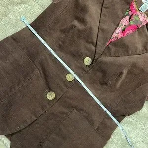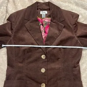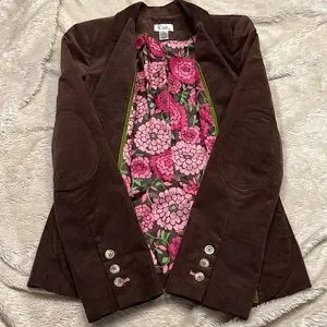 White Label Lily Pulitzer Vintage Blazer. Brown corduroy with three front button closure. Elbow patch details. Pink stitch touch on each sleeve’s 3rd button opening. Perfectly lined in gorgeous floral silk. Classic Lilly Pulitzer piece. Approximate measurements: (laying flat) Bust: 17" /Shoulders 16"/Length 24"