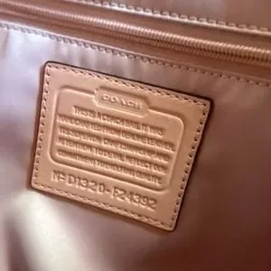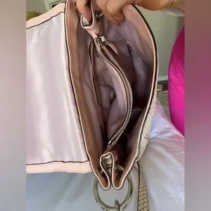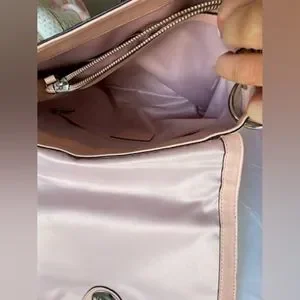 • 13 1/4" (L) x 10" (H) x 5" (W) comes with dust bag and care card. this has one small spot .very nice purse has a hint of peach pink color with pink interior