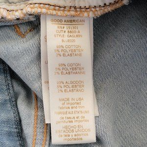 Good American denim jeans, size 2; size 26. Good Legs jeans. Light wash blue denim jeans. Color: Blue020. Skinny jeans. Distressed; destroyed. Stretch; stretchy. Zipper and button fly closure. Casual. Streetwear. Contemporary. Luxury.