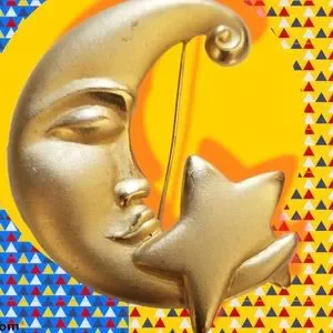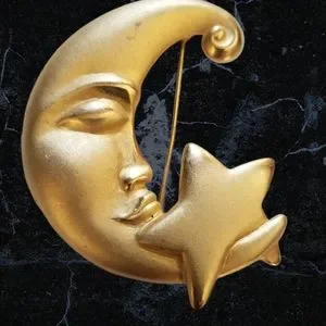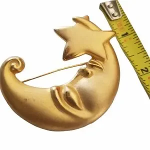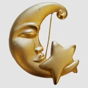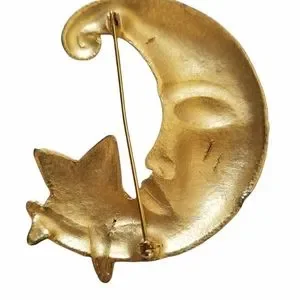 Vintage hippie style 1970s moon and star brooch is such an iconic design of that decade. Featuring a matte gold tone metal finish, this large beautiful brooch will add instant Boho charm to your wardrobe.