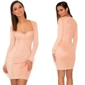 Style: Long Sleeve / Bustier / Sweetheart Neck / Zip Closure / Corset Front / Mini / Bodycon / Slimming / Suedette / Ultrasuede / Microsuede