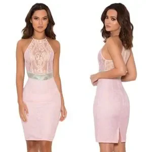 House of CB London Women's Dress Alvaro Pink Purple Pastel Floral Lace Halter Bodycon - Please note the skirt is lined but the top is completely sheer.