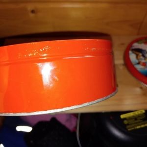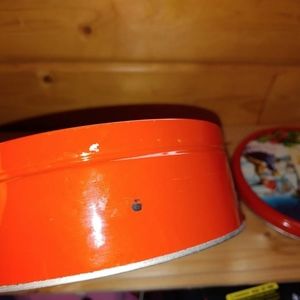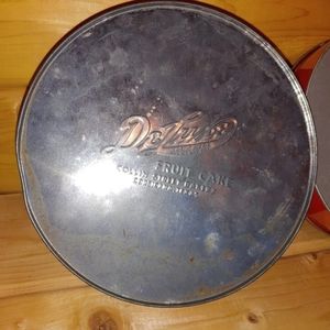 Two Vintage Collin Street Bakery DeLuxe Fruit Cake Tins Holiday Winter Christmas scenes and Cowboy at Alamo. From Corsicana Texas. Apprx. 8" dia x 3" high. One is older vintage, guessing 1970's. One in better condition: minimal paint loss to graphics, clean interior. Newer one has paint peeling on lid, please see pics for condition. Bottom very clean; a few corrosion/scuff marks on side. Older tin has very corroded interior. Also has some dents, mostly around bottom rim. Top graphics in nice condition.