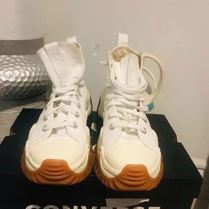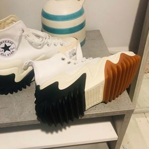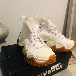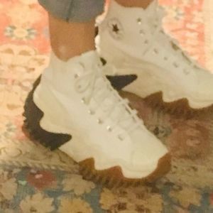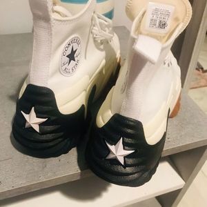 New in box. I have a 6 (womens 8.5 to 9 no matter what the converse size chart says) and a 6.5 (woman’s 9 to 9.5) comfy adorable and they add 2 inches to height! A fab and unique shoe. Price is firm.